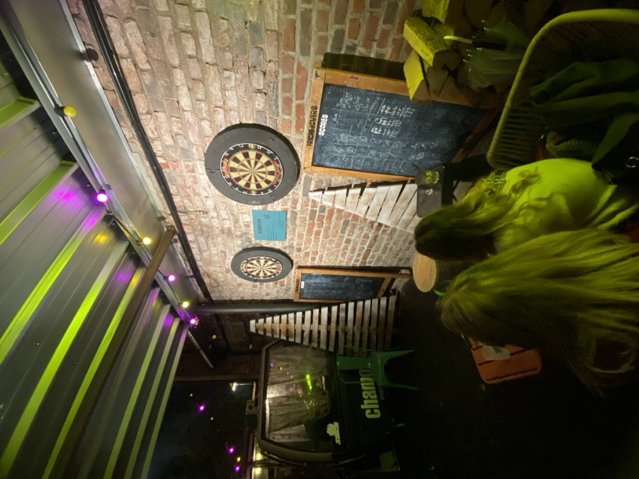 A cluttered interior scene features two dartboards mounted on a brick wall above a wooden xylophone. Next to the top dartboard is a chalkboard with writing. Two people are in the foreground, their backs to the camera, obscuring a wooden chair and table. Below the xylophone, a green "Champion" painted machine is visible. The scene is illuminated by string lights along a corrugated metal wall.