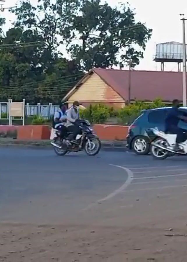 street in Kaduna, Nigeria. A silver Mercedes-Benz is parked on the side of the road. Two motorcycles pass by. A green Peugeot is parked on the other side of the road. A yellow taxi and a yellow three-wheeled taxi are also visible. A man in a brightly colored shirt and red pants walks across the street in the foreground. Another man in a green reflective vest and black pants crosses the street to stand near the parked silver car.