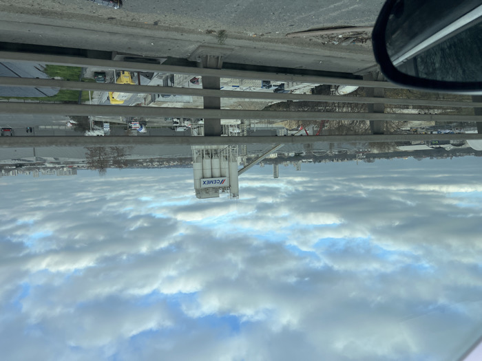 This image captures an industrial landscape in Gennevilliers, France, viewed from an elevated perspective, likely a bridge or overpass. The sky is partially cloudy with patches of blue visible through grey stratocumulus clouds. In the immediate foreground, the top-left section of a dark vehicle's side mirror is visible, reflecting a distorted view of the road surface. Below this, the gritty, dark asphalt of a roadway extends, showing scattered debris and dirt. Horizontally across the lower half of the frame, a concrete bridge railing with two parallel beams and vertical supports separates the foreground from the midground. The midground is dominated by an active industrial facility. A prominent CEMEX concrete batching plant stands centrally, featuring tall, light grey silos with the "CEMEX" logo prominently displayed. Surrounding the plant are paved areas and various industrial vehicles, including several cement mixer trucks (one yellow mixer clearly visible), other large commercial trucks, and smaller automobiles. A red bus-like vehicle and several dark-clad figures (people) are discernible in the far right midground, indicating human presence. The terrain is a mix of paved surfaces, dirt, and sparse, leafless trees. The background presents an extensive urban and industrial panorama. Numerous low-rise buildings and warehouses stretch across the horizon. A distinct, tall, slender high-rise building (likely Tour Mozart) is visible in the distant background, signifying a more developed urban area beyond the immediate industrial zone. No specific actions or interactions are discernible due to the distance, beyond the general operation of an industrial site.
