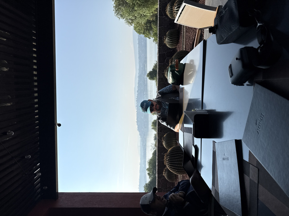 The image depicts an outdoor covered patio area, likely a restaurant or cafe, situated in Pueblo Nuevo de Jasso, Mexico, overlooking a large body of water with distant hills under a clear blue sky. Two adult males are seated at a dark, reflective rectangular table in the foreground, which is largely in shadow. The man on the right, wearing a teal baseball cap with "Titleist" branding and dark sunglasses, is actively engaged with an open laptop computer positioned directly in front of him. To his right on the table, a dark green rectangular bag is visible. The man on the left, partially obscured by shadow, wears a light-colored baseball cap and a dark jacket, sitting with his hands clasped in front of him, appearing to observe or listen. On the table in front of the left man, a dark menu book with "AMALIALLI" embossed is present on a woven placemat. Another similar menu book is further towards the bottom center of the frame. To the far right of the table, a dark case and a pair of sunglasses are visible. Beyond the table and the seated individuals, a low decorative wall or planter contains several large, spherical golden barrel cacti. This planter acts as a partition before a wide expanse of calm water, which stretches across the midground. The far bank of the water features green forested hills and subtle indications of distant structures under a bright, cloudless sky. The overhead structure consists of a dark slatted wooden ceiling from which several exposed incandescent light bulbs hang. A small, dark spherical object, possibly a security camera, is attached to a ceiling beam near the top center of the frame. The overall lighting contrasts the shaded patio with the brightly lit exterior.