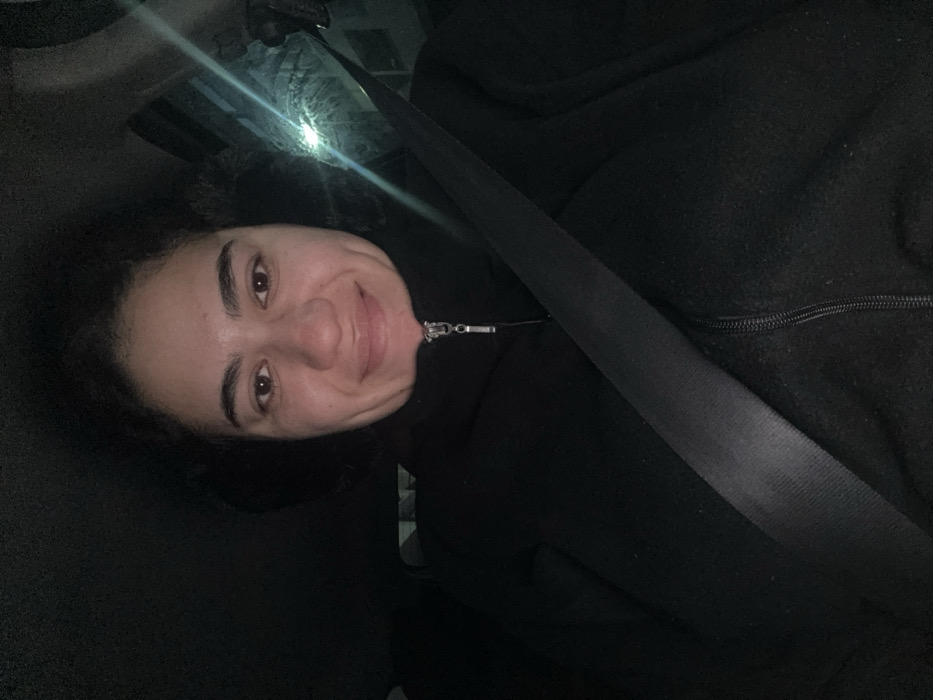 A person wearing a black hooded jacket and seatbelt smiles at the camera inside a car. A streetlight shines through the window, casting a glare. The individual has dark hair, light skin, and brown eyes. The interior of the vehicle appears dark and the seatbelt crosses diagonally across the person's body.