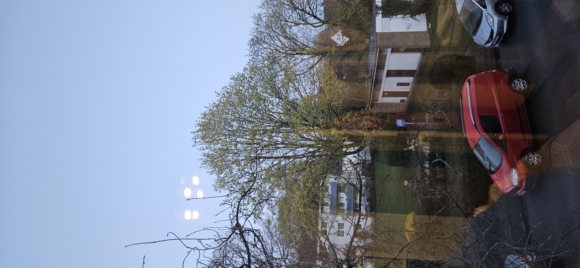 The image depicts an outdoor residential scene in Gütersloh, Germany, viewed through a reflective window. The perspective is elevated, looking down and across a street or parking area towards buildings and greenery. The sky, a light blue, occupies the upper half, exhibiting four prominent, bright, circular reflections of interior light sources in the upper-left quadrant. In the foreground, dark, bare tree branches are visible on the left, indicative of late winter or early spring. Several large trees with nascent light-green foliage are central, suggesting early spring. The mid-ground features a white multi-story residential building with blue balcony railings on the left. To the right, a single-story utility building constructed of brick and white panels, with multiple doors, stands next to a lawn. The white panel on the right of this utility building has graffiti, specifically the word "KREBS" visible. A blue rectangular sign with white symbols is located near this building. In the lower foreground, a dark paved surface holds two parked vehicles. A red Ford Transit Connect or similar compact van is positioned in the lower center, facing left. Behind it, on the right, a silver Honda Fit or similar compact hatchback is parked, also facing left. Subtle reflections and glare from the viewing window are present across the entire image, slightly obscuring details and creating a layered effect. No individuals are present.