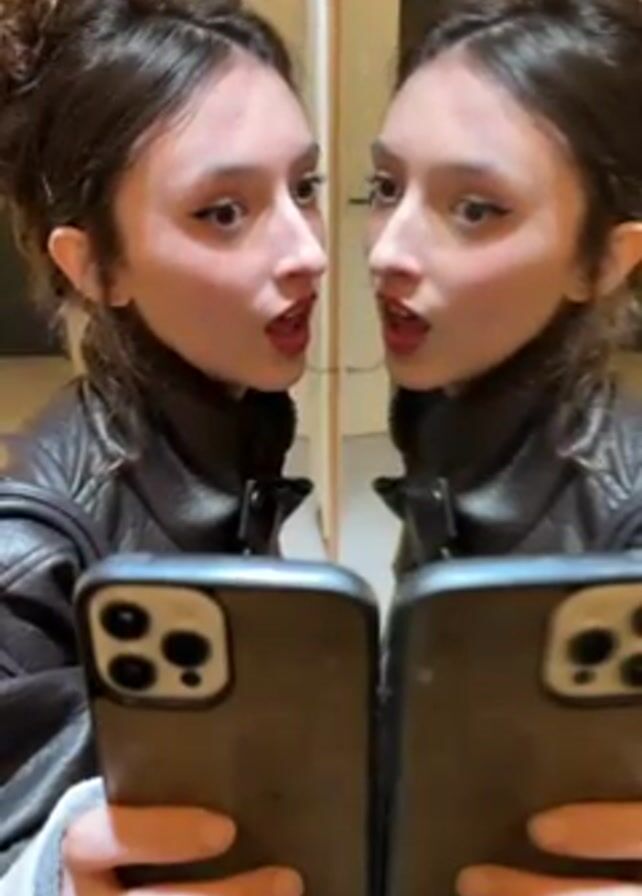 A young woman in a dark leather jacket stands in front of a mirror, holding her phone and looking at her reflection. Her hair is styled in a messy bun, and she is wearing red lipstick and eyeliner. She is opening and closing her mouth slightly, as if practicing or mimicking a sound. The background is blurry, but appears to be an interior space with doors.