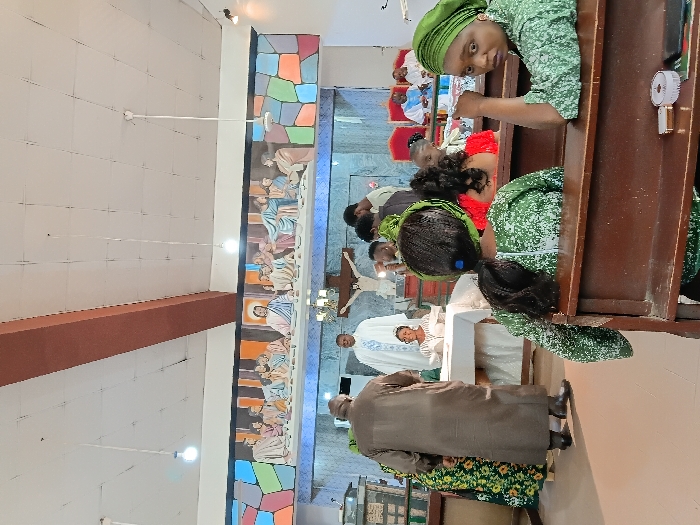 Inside a church, people are seated in pews, dressed in various patterns and colors. A priest stands near the altar, conducting a service. A decorative mural featuring biblical scenes adorns the wall above and to the left of the altar. The interior is brightly lit with lights. The picture has a slight fisheye effect, likely due to the camera lens.