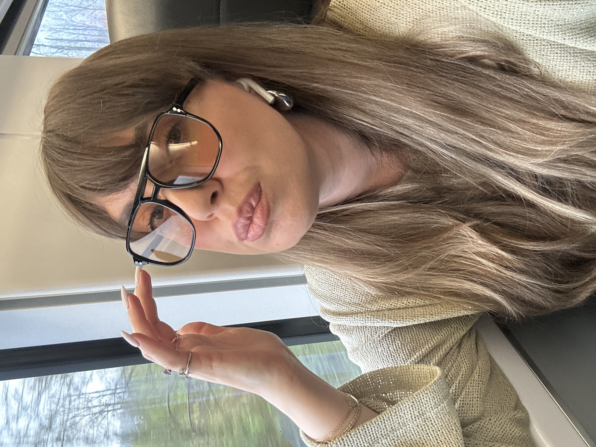 A woman with long brown hair and bangs is wearing eyeglasses and a tan sweater on what appears to be a train
