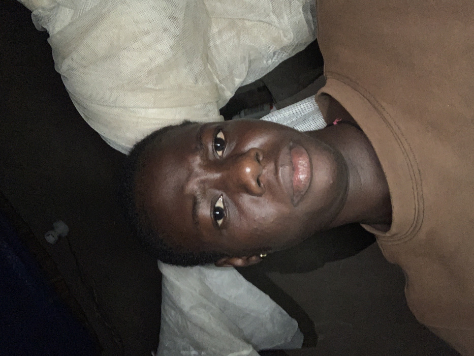 A portrait-oriented image displays a single individual with dark skin, short dark hair, and brown eyes, looking directly into the camera. The individual's brow is furrowed, and their lips are slightly parted, conveying a serious or quizzical expression. They wear a plain, long-sleeved brown crew-neck shirt and a small gold stud earring in their visible left ear. The scene is dimly lit. The background consists of dark, undefined areas and light-colored, possibly white or off-white, fabric or plastic material bunched up on the right side and partially visible on the left. A small, light-colored object is faintly discernible in the upper left background. The environment appears to be an indoor or enclosed space and does not feature identifiable landmarks specific to Zaki Biyem, Nigeria.