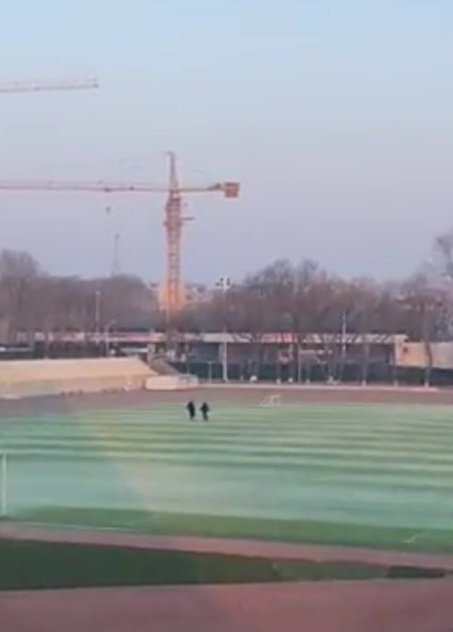 long shot of a sports field with two figures walking across it. The field is marked with horizontal lines and appears to be covered in a light frost or dew. In the background, there is a construction crane, trees, and a building. The sky is a pale blue. The figures on the field are small and indistinct.