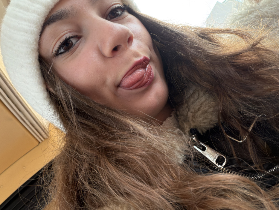 A close-up, angled photograph captures a young female subject from the chest up, situated in Hoenheim, France. She wears a white ribbed knit beanie and a dark jacket featuring a light brown, possibly faux fur, collar. A metallic zipper pull on the jacket is visible, bearing the debossed brand name "BERSHKA." The subject has long, wavy light brown hair, which frames her face. Her face is turned slightly to the viewer's right, and she exhibits a playful expression with her tongue partially extended from her mouth, coated with a red substance consistent with lip gloss or lipstick. Her eyes are open, with visible mascara on the eyelashes. The immediate background shows an overhead warm yellow-brown surface and a bright, undifferentiated light source to the subject's right.