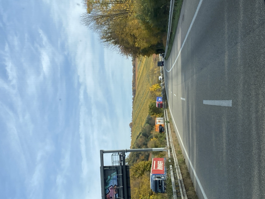 The image depicts a two-lane asphalt highway, likely in the vicinity of Weinsberg, Germany, viewed from the perspective of a moving vehicle. The roadway features white dashed lane dividers and a solid white line marking the right edge, curving gently to the right in the distance. The sky above is light blue with scattered, thin white clouds. To the left of the highway, a metal guardrail separates the road from a lower-lying area where three heavy goods vehicles (HGVs) or trucks are visible, positioned on what appears to be a parallel access road or shoulder. The closest truck has a blue cab and a red trailer with "WINNER" inscribed in white. The next truck has an orange cab and a white trailer, followed by a red cab with a blue trailer. Above these vehicles and spanning across the highway is an overhead gantry structure, featuring colorful graffiti on its dark panel. Beyond the immediate roadside, a prominent vineyard, displaying extensive autumnal yellow and golden foliage, slopes upwards on the left. To the right of the highway, a similar metal guardrail runs parallel to the road, behind which a dense line of trees with yellow, orange, and some bare branches indicates autumn foliage. Further down the road, two dark-colored vehicles are visible in the distance, traveling in the same direction. Shadows are cast across parts of the road surface. No discernible individuals are visible in the scene.