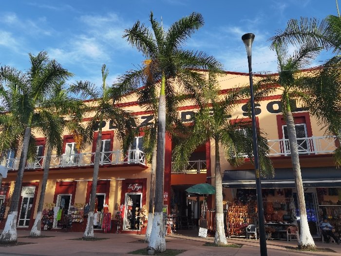 row of shops in Cozumel, Mexico, located at latitude 20.51 and longitude -86.949. The shops are situated in a building with a peach-colored facade and a red trim, adorned with a black sign reading "Plaza del Sol". The building features several palm trees in front of it, and there is a black awning above the shops. The shops appear to be selling various goods, including leather items, clothing, and souvenirs. The street is lined with white painted curbs, and the shops have glass doors and windows. One person is visible in the image, a man standing outside a shop. The sky is blue with scattered white clouds. The sun is shining brightly, casting long shadows from the palm trees. There are two black lampposts on the sidewalk. The image is taken at an angle, providing a wide view of the shops and their surroundings.