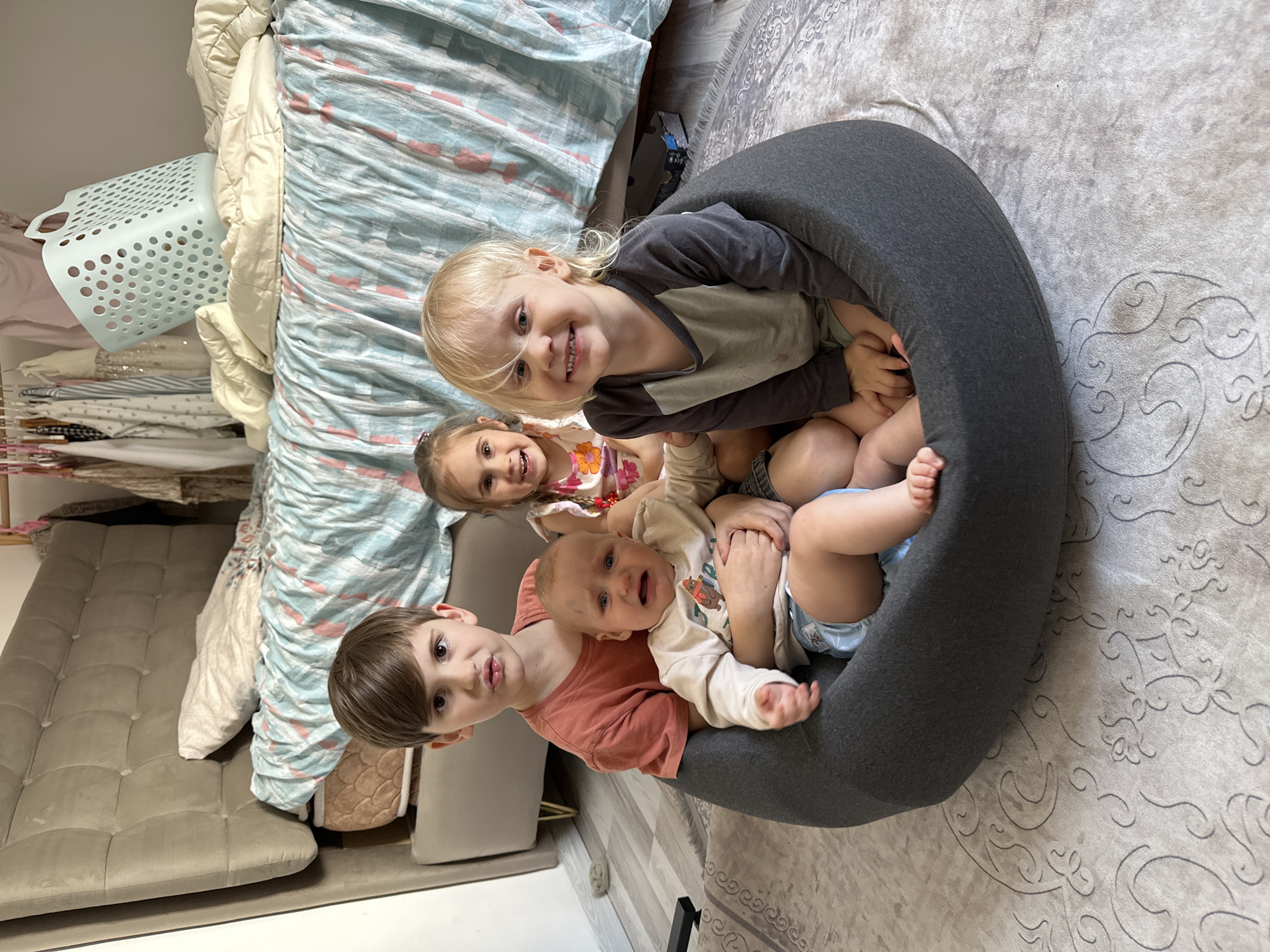 Four young children are positioned inside a gray, donut-shaped cushion on a patterned rug. An older boy in an orange shirt holds a baby in a white onesie. A girl with blonde hair wears a grey shirt and smiles, as does a younger girl in a floral dress. Behind them is a bed with a blue and white patterned comforter and a gray tufted couch. A blue laundry basket sits on a shelf near clothes hanging on a rack. The location is indeterminable.