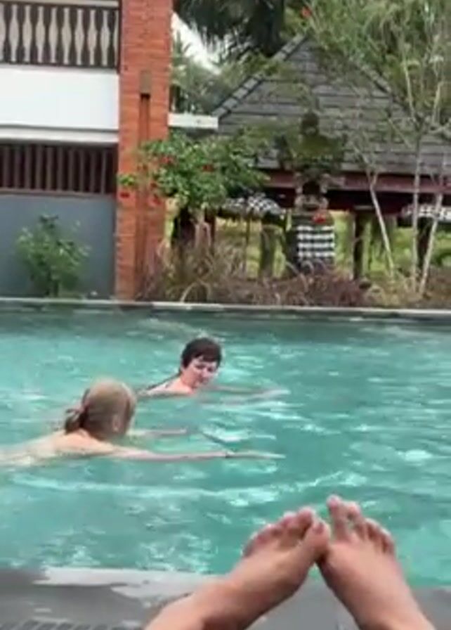 person's point of view lying on a pool-side lounge chair, with their feet visible in the foreground. The main focus is on two people swimming in a turquoise swimming pool, doing what appears to be a breaststroke. Lush tropical vegetation, including palm trees, surrounds the pool area. A Balinese-style structure with a distinctive checkered pattern adorns one area of the background. A multi-story building of tan color with brick-like exterior accents is partially visible in the background, to the left of the frame. The lighting suggests an overcast day. The water surface reflects the sky, slightly distorting the reflections of the surrounding objects.