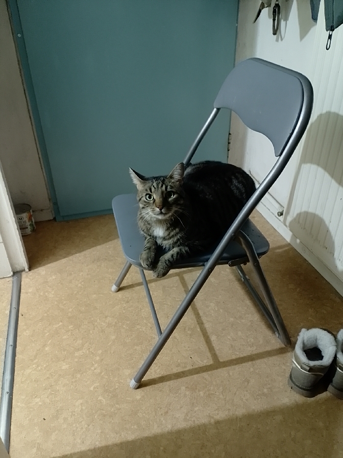 - "A gray tabby cat sits on a gray folding chair" by FM-5n8Vg2, licensed under CC BY 4.0