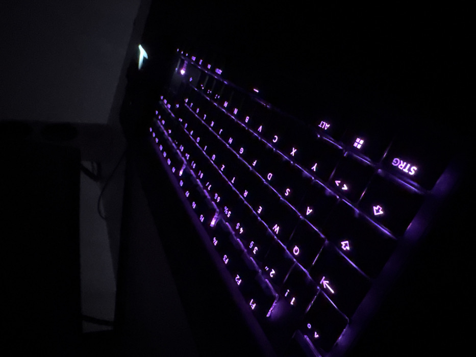 The scene depicts a computer setup within a dimly lit indoor environment, identified as the city of Forbach, Germany. The primary subject is a full-sized computer keyboard, positioned on a dark, flat surface, presumably a desk. The keyboard keys are illuminated with purple backlighting, clearly displaying a QWERTZ layout with a "STRG" (Control) key, characteristic of German keyboard standards. Key rows from F1 to F12, the number row, alphanumeric keys, and modifier keys are distinctly visible due to the backlighting. No individuals are present, and no actions or interactions are occurring; the scene is static. In the upper left background, the lower portion of a dark computer monitor is visible, along with dark cables on the desk surface extending towards it. A faint, lighter-toned wall or surface is discernible behind the monitor. In the upper right background, a small, light-emitting object with a green or cyan glow is present, possibly an indicator light from a peripheral. The overall environment is dark, with the keyboard's illumination serving as the predominant light source.