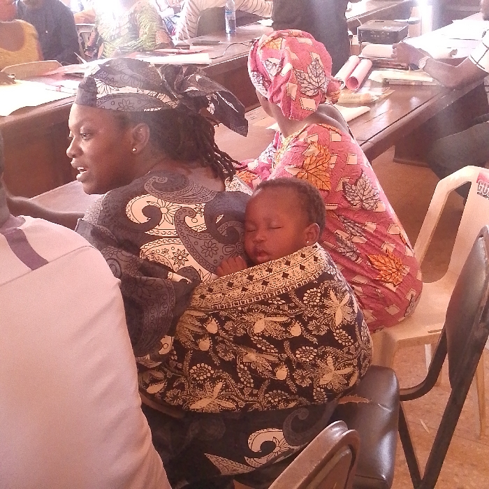 An indoor scene in Gumel, Nigeria, features a woman seated, facing left in profile, carrying a sleeping infant on her back