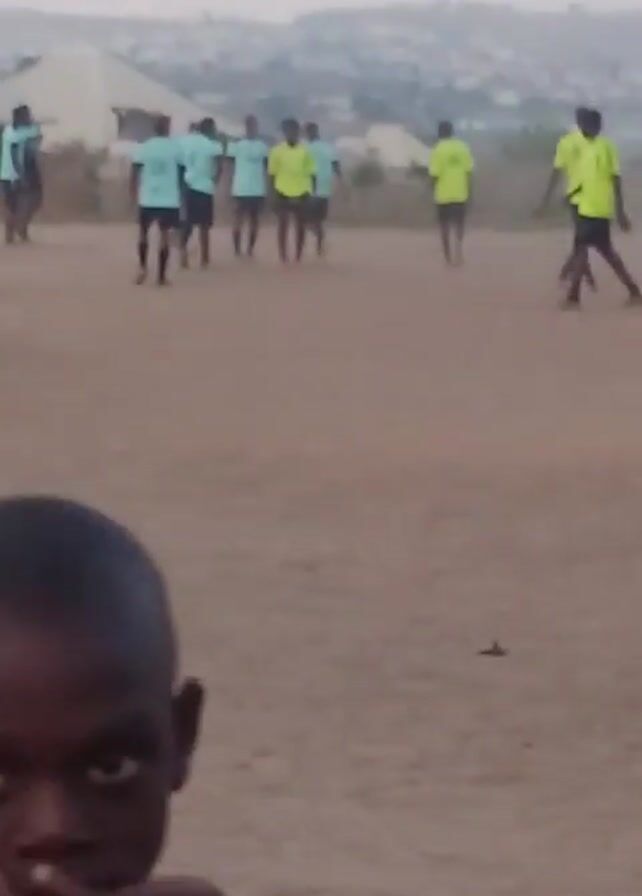 group of young men in light blue and neon yellow shirts, seemingly practicing or playing a game on a dusty, reddish-brown field. They are in the middle of the field, moving around. The background shows a hazy, distant cityscape with a large, light-colored building. The overall lighting suggests it might be late afternoon or early morning.
