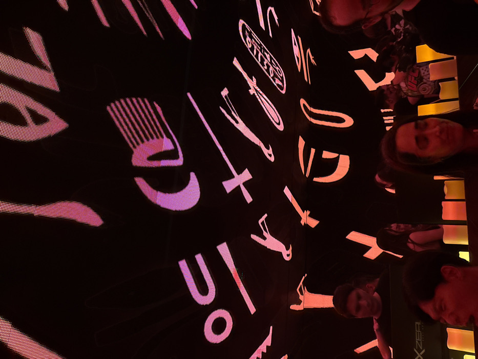 The scene depicts the interior of Topaz (formerly Topaz Deluxe) nightclub or bar in Monterrey, Mexico. The environment is predominantly dark, illuminated by a large LED ceiling that displays abstract, stylized symbols and shapes in vibrant pink, purple, and orange hues. Below the ceiling, multiple individuals are present. In the foreground, a male with dark hair is partially visible on the left, looking away. Towards the center-right, a female with long dark hair stands with her face partially illuminated by warm, yellow-orange light emanating from a row of decorative blocks or LED candles on a surface below. A portion of another male's head and face is visible on the far right. In the midground, to the left, a male (likely a DJ) is positioned behind a dark counter featuring "XZER" branded equipment, his gaze directed downwards. Another female with long dark hair is visible behind him. Towards the right midground, several indistinct figures are present, one of whom appears to be wearing a shirt with a "UFC" logo. The individuals are standing, observing the environment, or engaged with equipment, consistent with a social gathering in an entertainment venue.