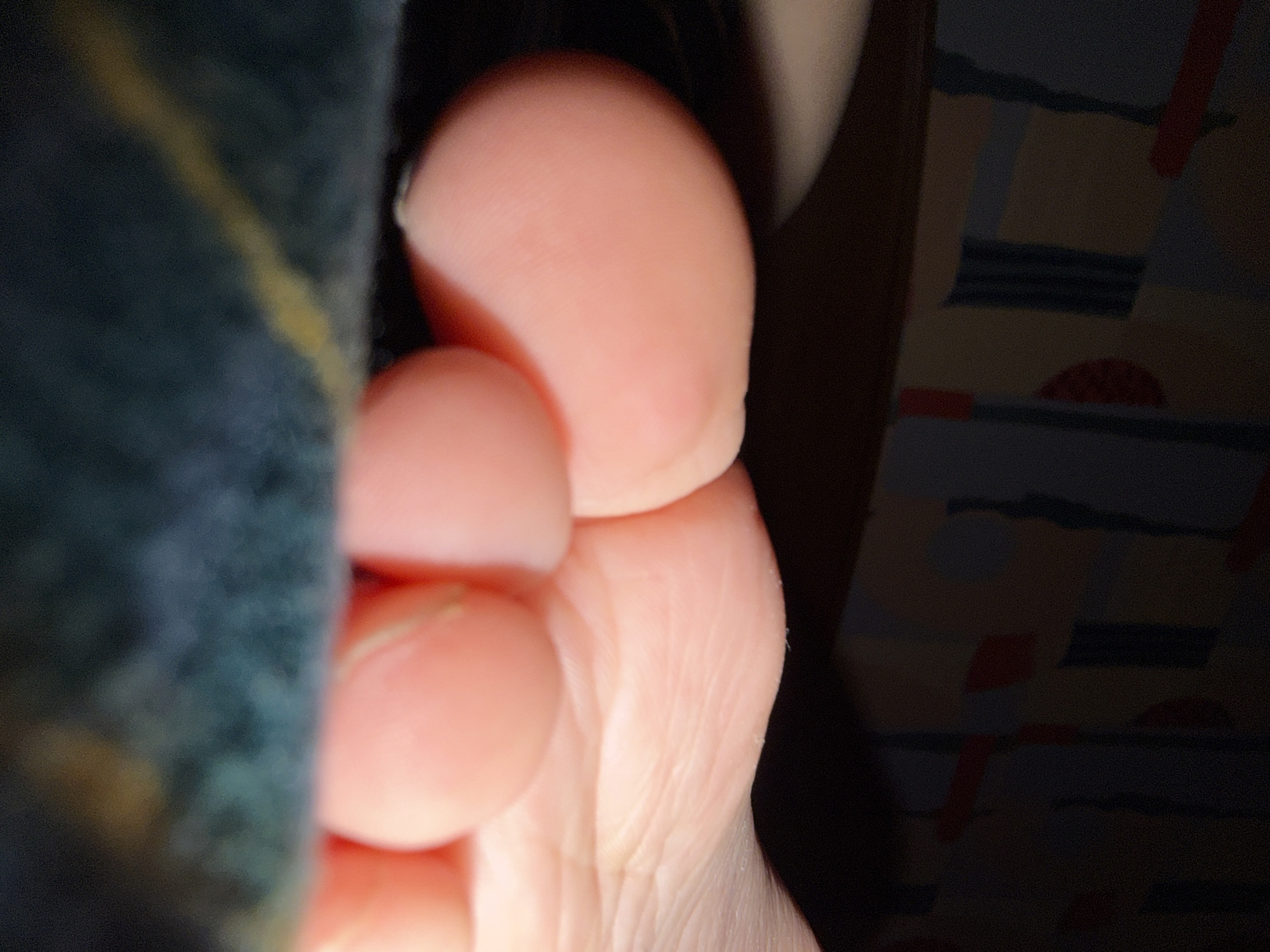 close-up of a human foot. The toes are prominent in the foreground, with the skin appearing smooth and slightly wrinkled. A blurred object with a green and gold pattern partially obscures the left side of the image. To the right, a patterned surface in shades of brown and red is visible. The lighting is dim, creating shadows and obscuring finer details. There is no information to suggest this image was taken in Chaikovsky, Russia.