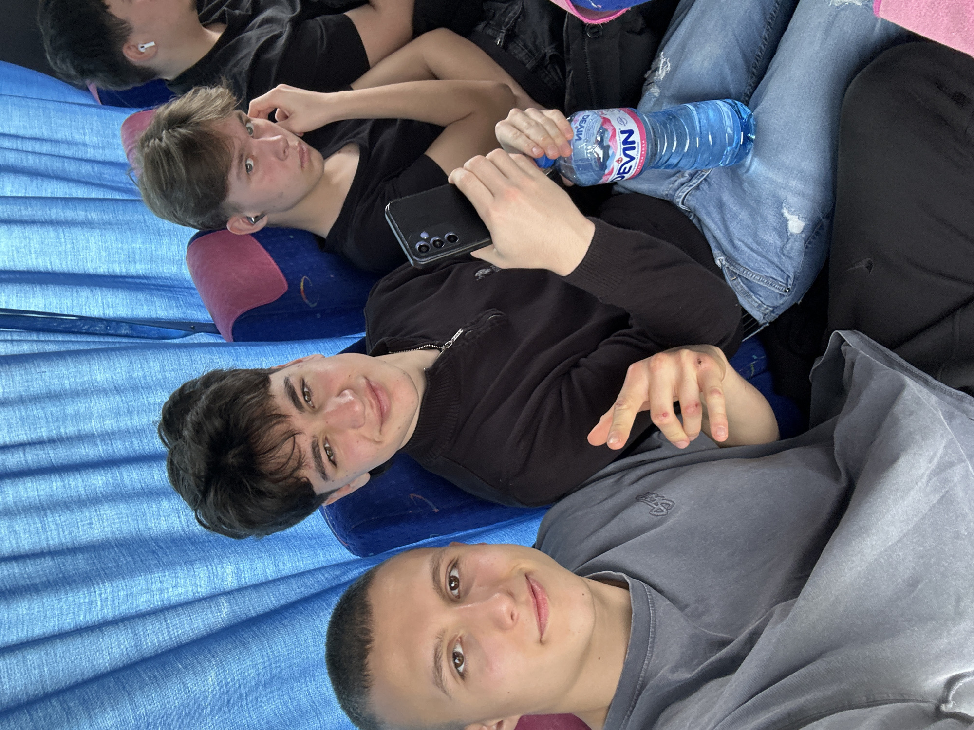 The scene depicts the interior of a passenger vehicle, likely a bus, located in Polsko Padarevo, Bulgaria. Four young males are seated in rows. Blue pleated curtains line the windows on the left side of the frame. The vehicle seats are upholstered with a reddish-pink material on the upper portion and a darker, possibly blue, fabric on the lower portion. In the foreground on the left, a male with a buzz-cut hairstyle and a grey t-shirt smiles directly at the camera, forming a V-sign with his left hand, which shows minor abrasions on the knuckles. Adjacent to him, in the middle of the frame, another male with dark, medium-length hair wears a black zippered polo shirt and distressed blue jeans. He also smiles towards the camera, holding a black smartphone in his left hand and a partially opened plastic bottle of "DEVIN" mineral water in his right hand. To the right, a third male with light brown, medium-length hair and a black t-shirt has a white earbud in his left ear. He looks towards his left, away from the camera, with his right hand resting near his chin. Partially visible in the far right background is a fourth male, wearing a black t-shirt and a white earbud in his right ear, looking away from the camera.