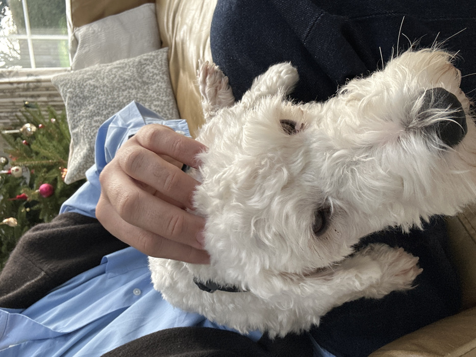 - "A close-up, indoor image captures a white, curly-haired dog resting on a person's lap" by FM-o3SHn1, licensed under CC BY 4.0