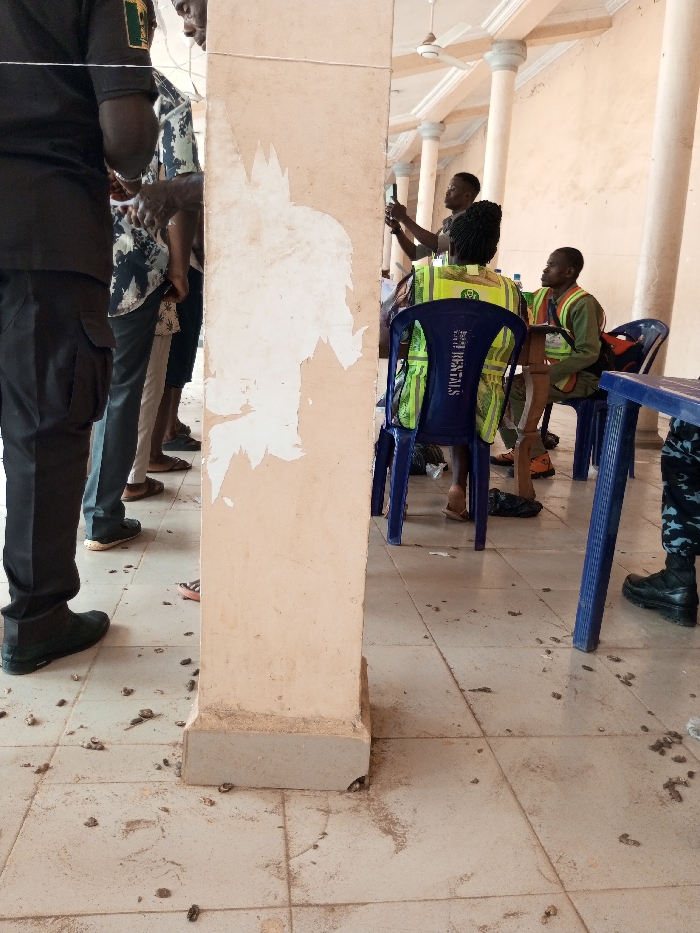 The scene depicts an indoor area within a building in Ajalli, Nigeria, characterized by a light-colored tiled floor and structural pillars. A prominent square pillar in the foreground, center-left, shows extensive peeling beige paint, revealing a lighter substrate. The tiled floor is visibly soiled with numerous small, dark, irregularly shaped pieces of organic debris and dirt. On the far left, a person is partially visible, wearing dark pants and black boots. To the immediate left of the central pillar, several individuals are standing, appearing to form a line; their lower bodies are visible, dressed in various casual pants and footwear including sandals. On the right side of the image, two individuals are seated on blue plastic chairs. The person closest to the camera is seen from behind, wearing a bright green and yellow reflective vest with "RENTALS" printed vertically on the back. To their right, another individual sits facing left, also wearing a similar green and yellow reflective vest. Behind these seated individuals, a person stands, holding a black smartphone horizontally at eye level, seemingly recording or photographing. A blue plastic table is partially visible on the far right. In the background, multiple round, light-colored architectural pillars are visible, supporting a ceiling where a white ceiling fan is mounted. The overall lighting suggests daytime.