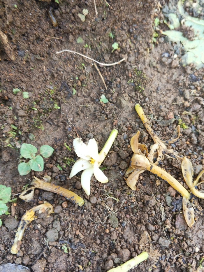 A fallen white flower with a yellow center rests on dark soil. To its left, small green plants sprout. Around the flower, decaying yellow flower stems and petals are scattered. Tiny black insects speckle the flower and stems. A thin, dry twig lies nearby. The soil is uneven, with small stones and patches of moss visible.
