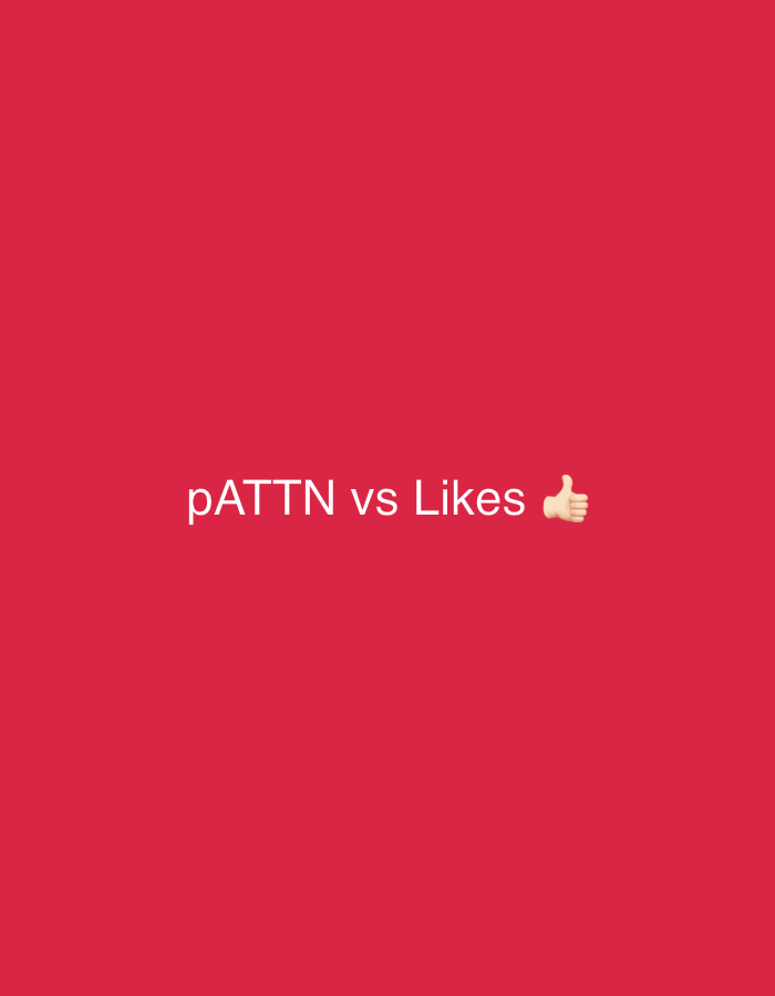 The image displays a digital graphic with a uniform, solid red background. Centered horizontally and positioned slightly below the vertical midline, white text reads "pATTN vs Likes". Immediately to the right of the word "Likes," a light-skinned hand emoji depicting a thumbs-up gesture is visible. No physical environment, individuals, or additional objects are present within the frame. The image does not depict a location in Interlomas, Mexico, or any other physical city.