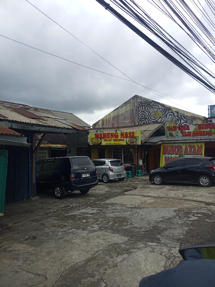 street scene with several food stalls or small restaurants. One stall is named "WARUNG NASI", advertising nasi (rice) and other dishes. Another stall advertises "Bubur Ayam," which is chicken porridge. Several cars are parked nearby, including a blue van. Overhead, numerous power lines are visible against a cloudy sky. The ground appears to be concrete or pavement with some cracks and discoloration.
