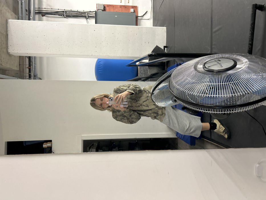A selfie of a blonde woman in a mirror. She holds her phone up and wears a patterned shirt and gray sweatpants. Behind her is a room with a large white concrete beam, black flooring, and a blue inflatable tube. A standing fan is positioned near the mirror, partially obscuring the reflection. A small bench is partially visible in the mirror.
