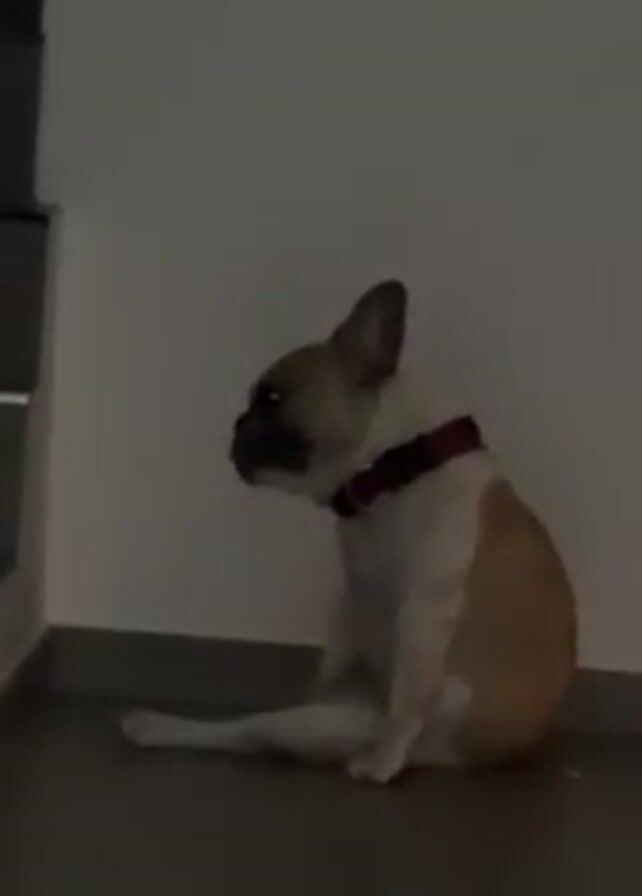 A French Bulldog dog sits slumped against a wall in a dim room. The dog's fur is primarily white, with some brown patches. It wears a maroon collar and is seated on a dark tiled floor. Its legs are splayed out, and its posture appears somewhat dejected or lazy. The room is dimly lit, casting shadows on the dog and the wall. The background is simple, with a corner showing a glimpse of dark furniture or an appliance. The video's focus is solely on the dog, capturing its peculiar sitting posture.