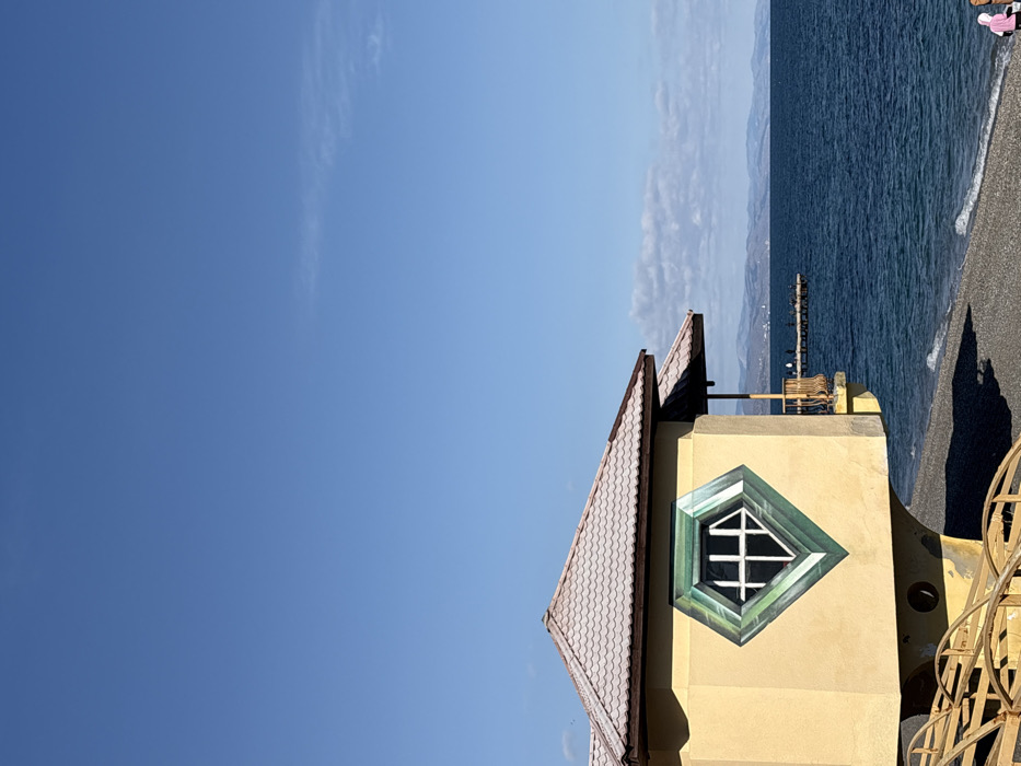 The image displays a coastal scene on a clear, sunny day in a coastal area of Ukraine. In the foreground, an ochre-yellow building with a brown tiled, hipped roof occupies the left side. The building features a prominent diamond-shaped window with white mullions, framed by an illusionistic painted green diamond border. A small wooden-railed balcony extends from the building's right side, overlooking the sea. Rusted metal structures are partially visible at the building's base in the lower left. The building casts a distinct shadow on the pebble beach that separates it from the water. The sea is dark blue and calm, exhibiting minor wave activity at the shoreline. In the mid-distance, a long, narrow pier extends into the sea. A range of mountains or hills is visible along the distant horizon. The sky above is clear and bright blue with a few faint, wispy clouds. Two individuals are partially visible on the pebble beach in the lower right corner, one wearing a pink top and the other a white top.