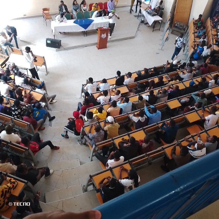 The image captures an indoor event within an auditorium or lecture hall, located in Machakos, Kenya, viewed from an elevated vantage point