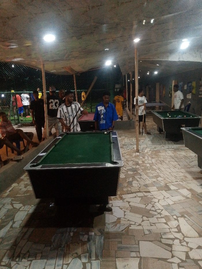An indoor recreation area features multiple pool tables. Several people are gathered around the tables, some playing pool and others watching. The room has a casual atmosphere, supported by simple overhead lighting and a makeshift roof. Outside a green fence, a soccer field can be seen. The floor is covered in tiles of varying sizes and shapes.
