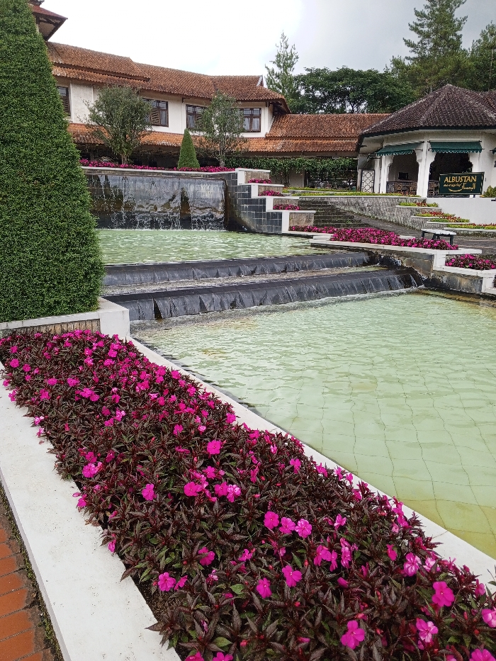 A tiered fountain takes center stage, cascading water down multiple levels into a pale green pool. Lush pink flowers line the pool's edge. Behind the fountain, a building with a terracotta-tiled roof is visible, along with green shrubbery. The fountain appears to be part of a hotel or resort, with "ALBUSTAN" visible on a building. The sky is overcast.