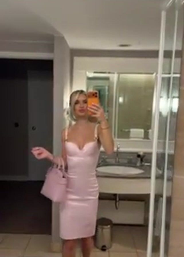 A woman stands in a hotel bathroom, taking a selfie in the mirror. She is wearing a light pink, form-fitting dress with gold straps and carrying a matching pink handbag. Her blonde hair is styled in a bun. The bathroom features a bathtub, sink, toilet, and a door leading to another room.