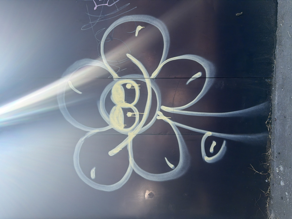 A stylized flower, possibly graffiti, dominates the image on a dark, seemingly metallic surface divided by a horizontal seam. The flower consists of rounded loops forming petals with teardrop-shaped accents inside. Its center features two interconnected circular figures resembling the number eight, with paint drips extending downward. The scene is brightly illuminated by a light source from the side, creating a lens flare effect. The edge of a sidewalk with some vegetation is visible on the right.