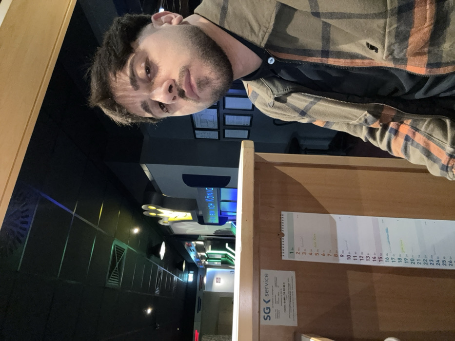 An indoor scene depicts a male individual, approximately 20-35 years old, with dark hair and a beard, looking directly at the camera