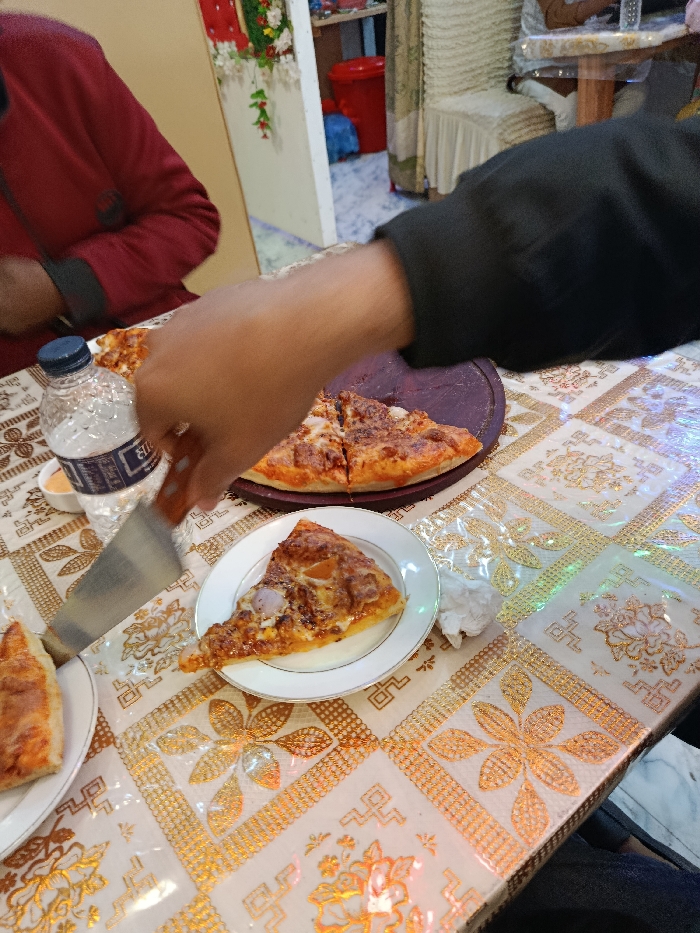 - "A person in a black shirt uses a metal spatula to serve a slice of pizza onto a white plate" by FM-1YwHv2, licensed under CC BY 4.0