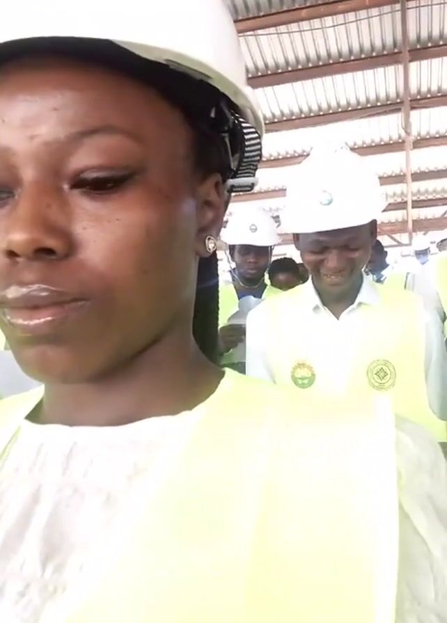 A woman in a white hard hat and yellow safety vest looks at the camera and smiles as she repeats a phrase that sounds like, "Yes I do." Behind her are other people in white hard hats and yellow safety vests. They are standing in what appears to be a warehouse with a corrugated metal ceiling.