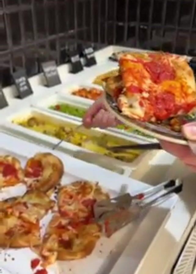 A person with painted fingernails uses tongs to serve themselves a piece of thick-crusted pizza from a buffet. The buffet features a variety of food items, including different types of pizza, rice, asparagus, corn, cheese, ham, bread, and other toppings and condiments. The buffet is well-lit and has a modern design.