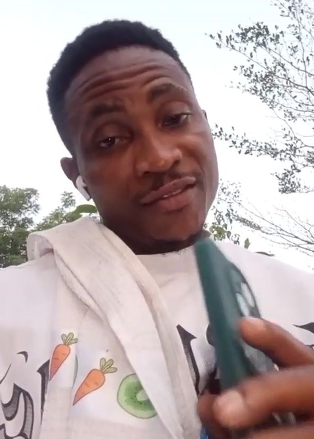 The video features a man looking directly at the camera. He is wearing a white patterned t-shirt, white wireless earbuds, and has a white towel draped over his left shoulder. He has short dark hair and appears to be speaking. The background shows a bright sky and trees with sparse leaves. He is holding a green object in his hand, but it is unclear what it is.
