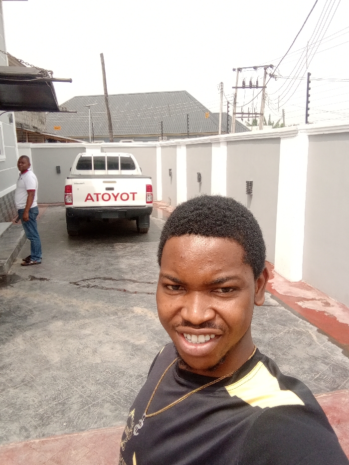 An outdoor scene in Igrwre-Ovie, Nigeria, depicts a paved compound area under daylight conditions. In the immediate foreground, a male subject with dark, curly hair, light brown complexion, and a faint mustache and beard stubble is shown from the chest up, smiling directly at the camera. He wears a black short-sleeved shirt with yellow/gold shoulder accents and a thin gold-colored chain with a pendant. To the left, a second male subject, dark-skinned, wearing a white polo shirt with red collar and sleeve trim, and blue jeans, stands facing partially right beside a light-colored building wall with a dark overhang. Centered in the mid-ground is a white Toyota Hilux pickup truck, identifiable by its rear profile and red "ATOYOT" branding (reverse of TOYOTA) on the tailgate, parked facing away from the camera. The background features a high perimeter wall, segmented in grey and white, fitted with multiple wall-mounted light fixtures and topped with electric fence wiring. Beyond this wall, a dark-roofed building and a wooden utility pole supporting electrical transformers and overhead power lines are visible against an overcast sky. The ground is covered with grey interlocking pavers, displaying several dark, irregular stains.