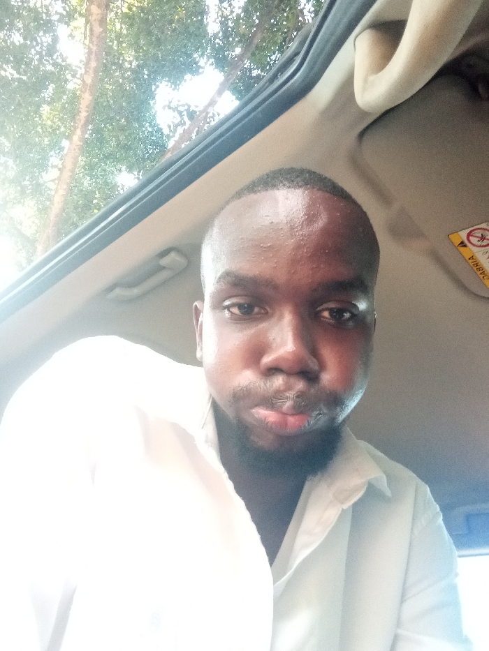 A dark-skinned adult male is depicted in a close-up, chest-up shot, situated within a vehicle
