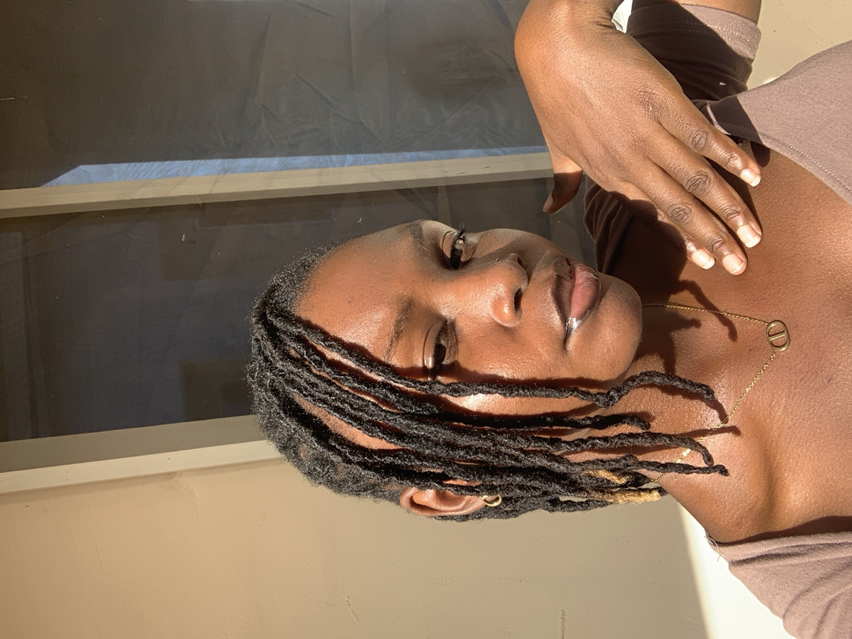 A dark-skinned female individual with black dreadlocks, some falling over her forehead, is depicted in an indoor setting