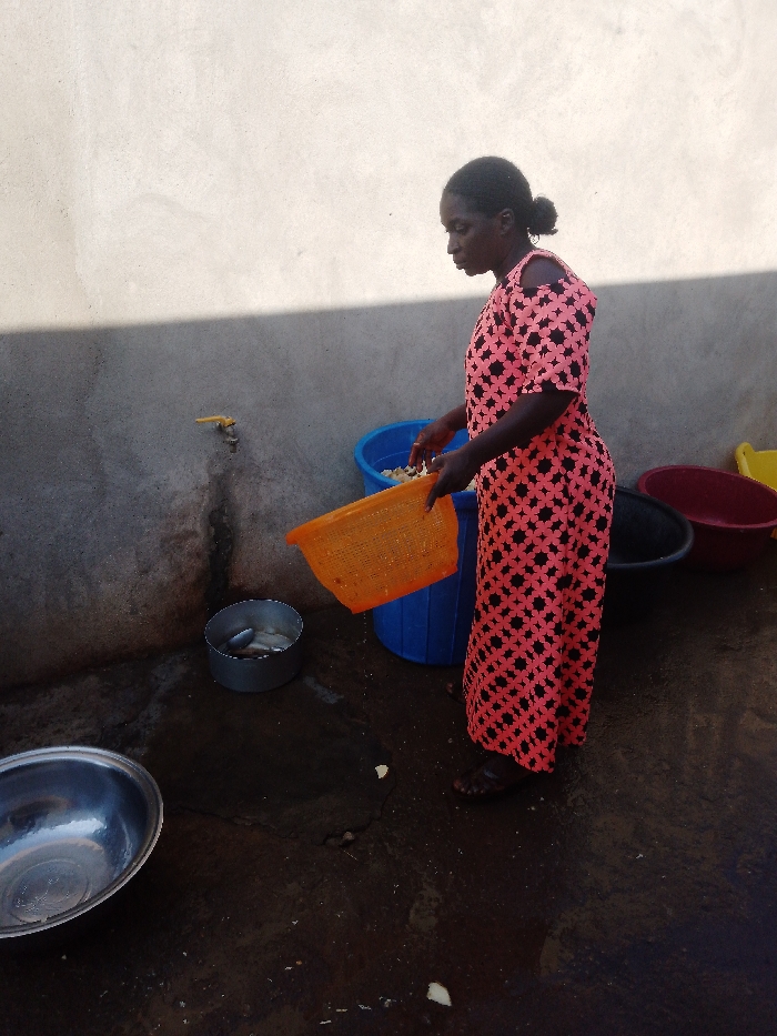 A woman in a long peach dress with black flowers stands outside. She holds an orange basket over a blue bin. Beside her, a metal bucket sits on the ground under a water faucet on a concrete wall. To the right are red, black, and yellow basins. A stainless steel bowl rests on the dark, wet floor in the lower left corner.