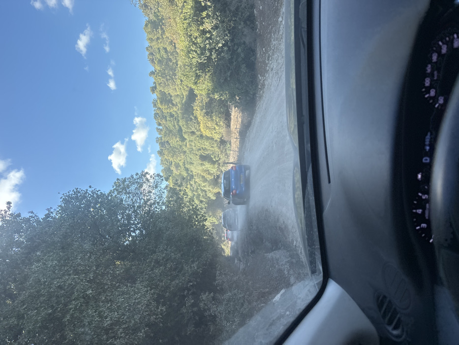 The image depicts a scene from inside a vehicle looking forward, traversing a dusty, unpaved dirt road within the Hof HaCarmel Regional Council, Israel. The foreground shows a partial view of a dark vehicle dashboard, including the top of a steering wheel and a digital instrument cluster displaying a tachometer, speedometer, and a "D" for drive gear. The windshield is visible, showing a light layer of dust. Ahead, a line of vehicles is observed moving on the dirt road, generating significant plumes of dust. The most prominent vehicle is a blue Suzuki Swift, followed by at least two other darker-colored vehicles in the distance, all heading away from the viewer. The environment consists of dense, green Mediterranean vegetation. On the left, a large, leafy tree with dark green foliage borders the road, casting some shadow. On the right, the road is flanked by dry, light brown ground and a wire fence with wooden posts. Beyond the fence, rolling hills covered in a variety of green trees and bushes extend into the distance. The sky is clear blue with scattered white cumulus clouds, indicating bright daylight conditions.