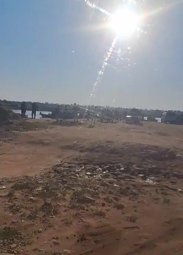 sunny day at a sandy beach or riverbank. Several people are gathered by the water's edge. There are a few vehicles parked in the background. The ground is mostly dirt and sand with some vegetation. The sun is bright in the clear blue sky. There is music playing in the background.