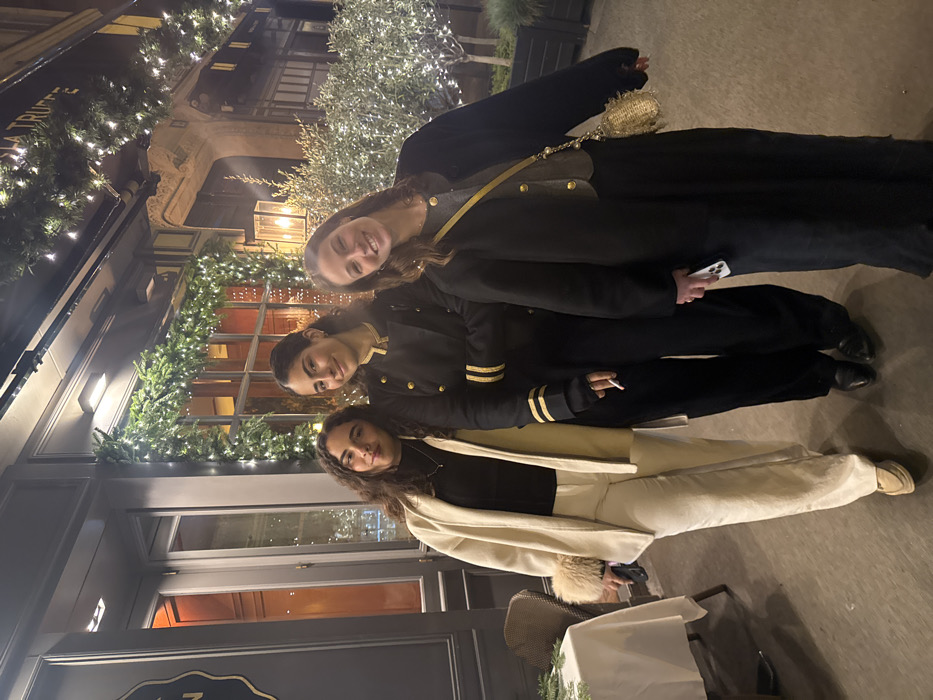 Three women stand close together outside a restaurant at night. Christmas lights adorn the building. The top woman wears a dark coat with a gold strap bag. The middle woman wears a dark jacket with gold stripes on the sleeves and holds a cigarette. The bottom woman has on a white coat with matching pants. A table with a white tablecloth is visible to the left.