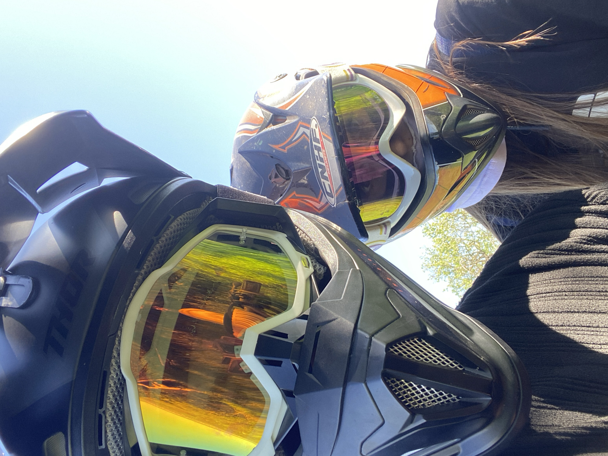 Two people wearing motocross helmets are facing the camera