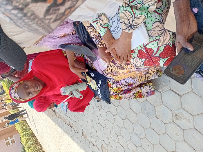 The image depicts an outdoor scene in the city of Kwazailewa, Nigeria, featuring multiple individuals on a paved area. In the immediate foreground, a dark-skinned hand holds a black smartphone displaying a profile picture and text. The ground consists of light grey hexagonal interlocking concrete pavers, showing some minor dirt. In the mid-ground, from right to left: A person, likely female, is seated, wearing a light-colored hijab and a dress with a prominent floral or leaf pattern in green, red, yellow, and black. Their hands are clasped on their lap, and a white bag with partially visible text "things will happen" is next to them. Adjacent to this individual, a woman is seated, dressed in a bright red hijab and a matching long garment. She has a patterned headband visible beneath her hijab. She holds a light green portable blender bottle with a straw in her right hand, while her left hand is extended and pointing towards the lap area of the person to her right. A black bag displaying "MISS YOU" and a gold design rests on her lap. Her gaze is directed forward. Partially obscured behind her, another person in a red hijab is visible, engaged with a book or tablet. The background features a light brown building with rectangular windows, situated behind a row of green shrubbery. Several other individuals are visible in the background, standing and walking on a paved surface, dressed in various casual and traditional attires. The scene is brightly illuminated by natural daylight.